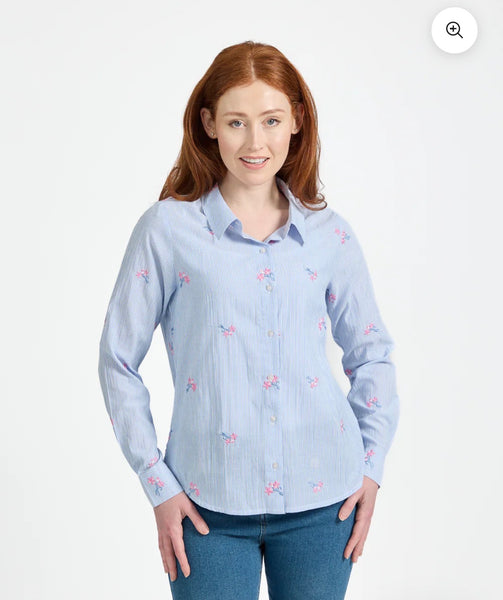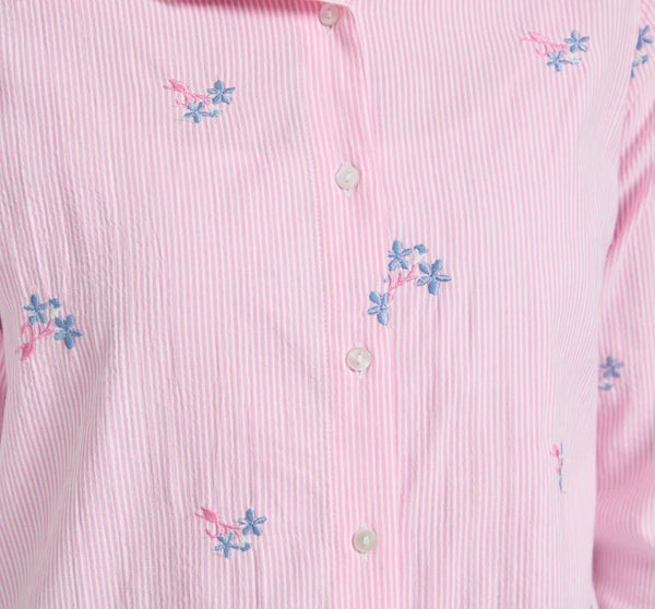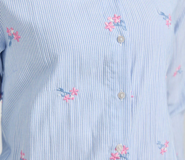 Make a stylish statement this spring–summer with thisFloral Embroidered Stripe Shirt. Adorned with intricate, colourful floral embroidery, this standout piece contrasts beautifully against the striped background for an eye-catching finish. Crafted from a cotton blend, it keeps you cool and comfortable on sunnier days while adding effortless charm to your look.