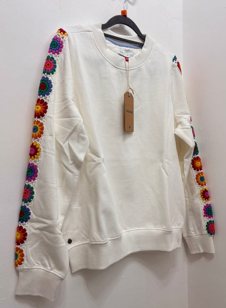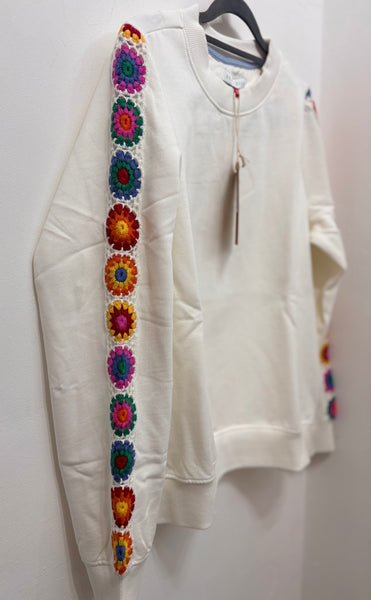 Our Jordan Crew Neck Sweatshirt is a true season standout. Made from a soft brush-back fabric, it’s perfect for cooler days or when the evening chill sets in. The deep ribbed crew neckline sits neatly, while the body fit is relaxed. A bright, floral crochet trim running down the sleeves adds a fun pop of colour that makes this piece anything but ordinary. Throw it on with your favourite denim and stand out in style.