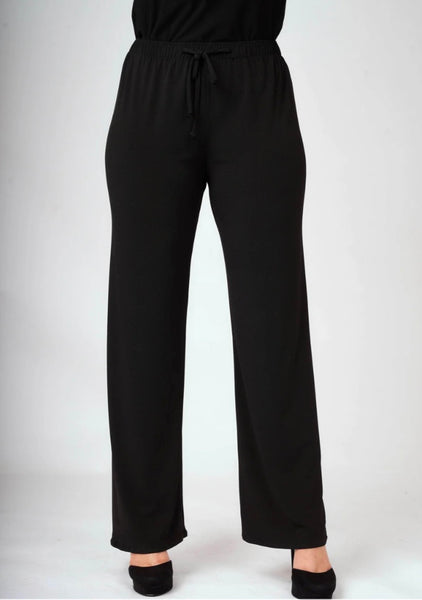 An elasticated wide-leg trouser with mocktie made from a smooth stretch fabric. Little to no need to iron, highly wash and wear-and-tear resistant.