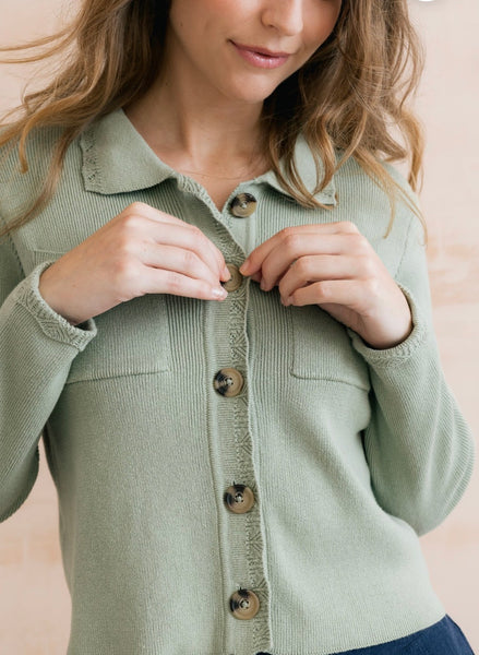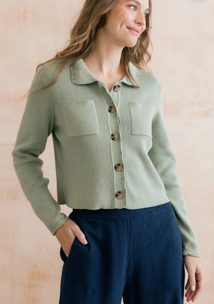 Clean simple lines with a chic boxy shape, the Piper spans the gap between cardigan and jacket. Made from organic cotton, featuring turn up scalloped cuffs and front patch pockets. Vintage inspired cotton lace trim at the collar, cuffs and placket adds thoughtful detail.