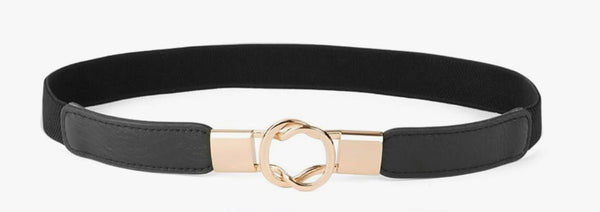 gold coloured metal buckle, slim stretch belt with gold coloured buckle detail